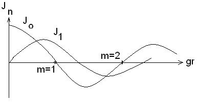 На рис.5.1 показаны Бесселевы функции нулевого и первого порядка (они похожи на затухающие косинусоиду и синусоиду). Аналогично выглядят и функции более высокого порядка. Пересечения этих кривых с осью аргументов x = gm r определяют значения корней, обращающих функции Jn в 0, и являющиеся решениями уравнения. Как видим решений бесконечно много, но они расположены не непрерывно, а дискретно, то есть не каждая волна или не каждый луч, даже если он в пределах апертурного угла, может распространяться по световоду.