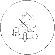 Стремление получить волокно одновременно с большой площадью модового пятна, малым допустимым радиусом и малыми потерями изгиба, короткой длиной волны отсечки и небольшим затуханием стыка привело к разработке нескольких оригинальных типов дырчатых волокон типа HALF. Например, предложено волокно со сплошной сердцевиной и с двумя рядами отверстий разного диаметра на периферии [3]: внутренний ряд малого диаметра и внешний ряд отверстий большого диаметра (рис.10.8).
