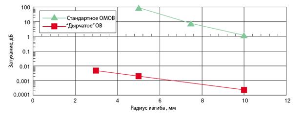 Гграфики затухания на изгибе стандартного и фотонно-кристаллических волокон в зависимости от радиуса изгиба показаны на рис.9.2 и 10.10. Как видно из графика, стандартное ОВ показывает очень большие потери на изгиб (порядка 100 дБ при радиусе изгиба 5 мм), в то время как «дырчатое» волокно вносит меньше 0.01 дБ. Следует заметить, что техническими условиями на волокно типа G.652 изгибы с радиусом менее 10 мм исключаются. У ФКВ нет ограничений на величину площади моды. Наиболее предпочтительным является использование волокна СВВО (HALF), т.к. оно обладает минимальными потерями, и может быть изготовлено совместимым с существующим традиционным оптическим волокном и соединительными элементами.