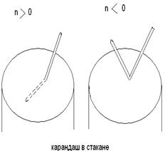Рис. 10.11. Кажущийся излом карандаша в воде при положительном и отрицательном коэффициентах преломления