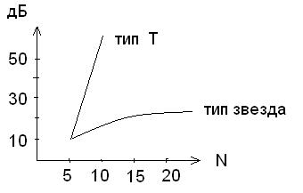 Рис.15.3. Зависимость затухания от числа разветвителей Т-образных и звездообразных