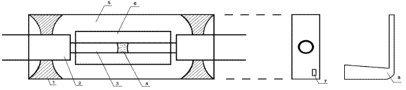 Сплайс состоит из пластикового корпуса (5) с наружными габаритами 50х8х3 мм, внутри которого расположена металлическая пластина (6) с внутренней центрирующей трубкой (3) с диаметром 125 мкм, заполненной иммерсионной жидкостью (4) с коэффициентом оптического преломления 1.5. Фиксация волокна (2) в буферном покрытии 0.9 мм в корпусе сплайса осуществляется с помощью механических подпружиненных зажимов (1), приводимых в действие с помощью металлического ключа (8) с прямоугольным сечением рабочей части.(7)