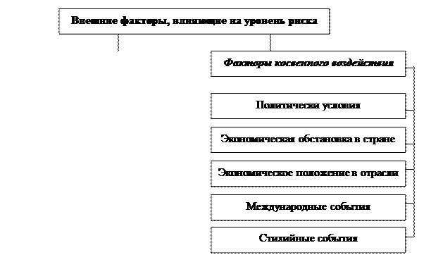 Внешние факторы, влияющие на уровень предпринимательского риска, подразделяются на две группы: факторы прямого и косвенного воздействия. Факторы прямого воздействия непосредственно влияют на результат предпринимательской деятельности и уровень риска. Факторы косвенного воздействия не оказывают прямого воздействия на деятельности фирмы и уровень риска, но способствуют его изменению.