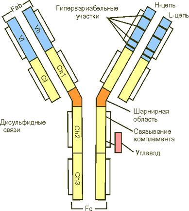 Константные участки цепей ответственны за другие свойства молекулы иммуноглобулинов. В области Сн2 и Сн3 доменов располагаются соответственно участок фиксации комплемента и участок, ответственный за фиксацию антител к клеткам, например к макрофагам, тучным клеткам, лимфоцитам; Сн 4 обеспечивает связывание мономеров в сложные агрегаты.