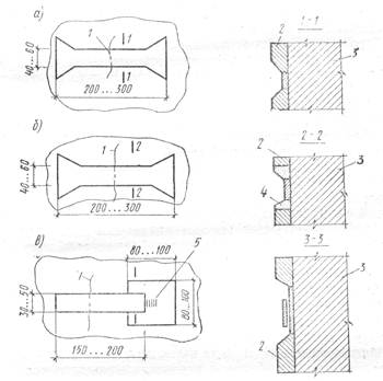 а — гипсовый; б — стеклянный; в — металлический; 1 — трещина; 2 - оштукатуренная поверхность; 3 - стена; 4 - алебастровый раствор; 5 — риски через 2...3 мм
