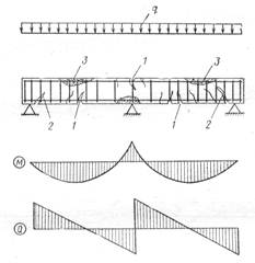 1 — нормальные трещины в зоне максимального изгибающего момента; 2 — наклонные трещины в зоне максимальной поперечной силы; 3 — трещины и раздробление бетона в сжатой зоне элемента