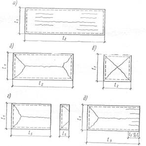 а - работающих по балочной схеме при l2/l1 ≥ 3; б – опертых по контуру при l2/l1 < 3; в – то же, при l2/l1 = 1; г – опертых по трем сторонам при l3/l1 ≤ 1.5; д – то же, при l3/l1 > 1.5