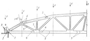 1 — наклонная трещина опорного узла; 2 — откол лещадок; 3 — лучеобразные и вертикальные трещины; 4 — горизонтальная трещина; 5 —вертикальные (нормальные) трещины в растянутых элементах; 6 — наклонные трещины в сжатом поясе фермы; 7 — трещины в узле нижнего пояса в месте примыкания растянутого раскоса