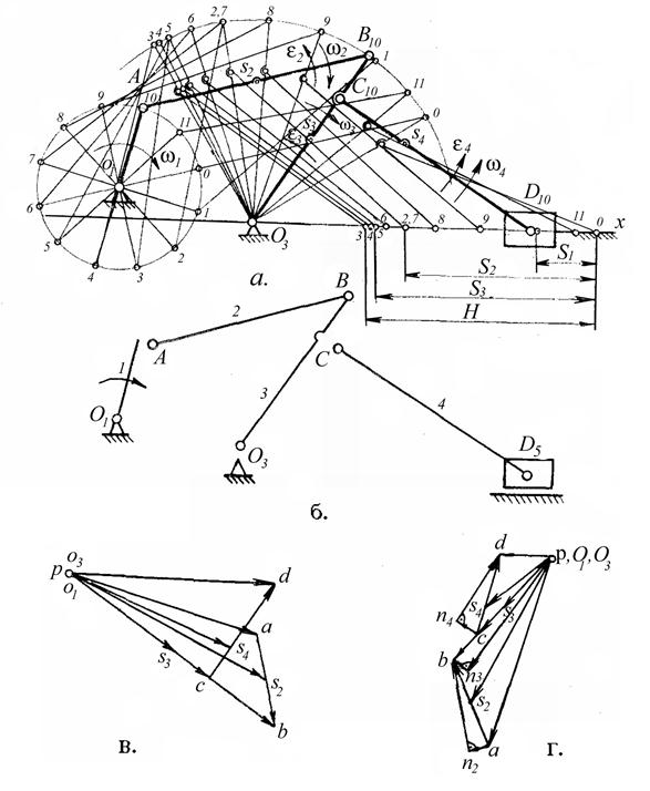 а —кинематическая схема; б — группы Ассура; в — план скоростей; г — план ускорений
