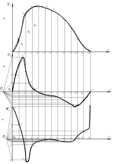 Аналогичным способом получим кривую ускорения (рис.2.2,в), дифференцируя график скорости. График ускорения, построенный путем графического дифференцирования кривой графика скорости, изображает закон изменения лишь касательного ускорения. Только в случае прямолинейного движения точки, когда нормальное ускорение равно нулю, построенный график отобразит (как в нашем примере) закон изменения полного ускорения. Начальная и конечная точки графика ускорения за время цикла движения механизма должны иметь одинаковые ординаты.