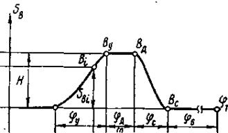 Наиболее типичным графиком зависимости между перемещением толкателя и углом поворота кулачка является кривая, приведенная на рисунке 3.4 для кулачкового механизма с поступательно движущимся толкателем.