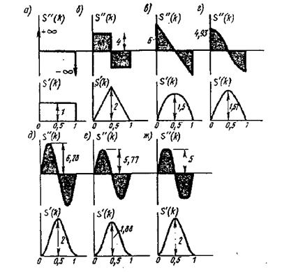 В практике проектирования наибольшее распространение получили относительно простые законы движения толкателя, заданные диаграммами аналога ускорения S "и аналога скорости S 'толкателя, показанные на рисунке 3.5 для фазы удаления толкателя: а - линейный; б - параболический; в линейно-убывающий; г - косинусоидальный; д - синусоидальный; е, ж - описанные полиномами.