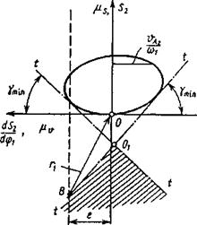 к оси абсцисс. Эти касательные продолжаем до их взаимного пересечения в точке O1. Заштрихованная область, определяемая пересечением предельных касательных t t, является областью центров вращения кулачков. Если углы