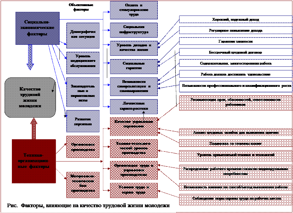 Схожей позиции придерживается И.В. Цыганкова. Исследуя качество трудовой жизни молодежи России, она выделяет социально-экономические и технико-организационные группы факторов (рис.). «Кроме того, каждый из факторов имеет как объективную, так и субъективную составляющую. Последняя дает представление о том, как сами работники оценивают влияние тех или иных факторов на качество трудовой жизни».