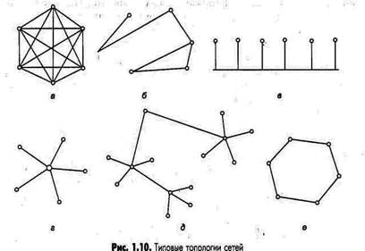В то время как небольшие сети, как правило, имеют типовую топологию — звезда, кольцо или общая шина, для крупных сетей характерно наличие произвольных связей между компьютерами. В таких сетях можно выделить отдельные произвольно связанные фрагменты (подсети), имеющие типовую топологию, поэтому их называют сетями со смешанной топологией (рис. 1.11).