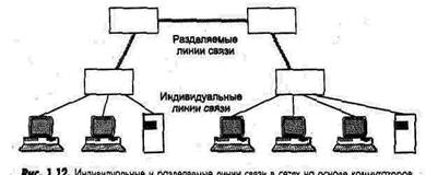 Сеть с разделяемой средой при большом количестве узлов будет работать всегда медленнее, чем аналогичная сеть с индивидуальными линиями связи, так как пропускная способность индивидуальной линии связи достается одному компьютеру, а при ее совместном использовании — делится на все компьютеры сети. Часто с такой потерей производительности мирятся ради увеличения экономической эффективности сети. Не только в классических, но и в совсем новых технологиях, разработанных для локальных сетей, сохраняется режим разделяемых линий связи. Например, разработчики технологии Gigabit Ethernet, принятой в 1998 году в качестве нового стандарта, включили режим разделения передающей среды в свои спецификации наряду с режимом работы по индивидуальным линиям связи. При использовании индивидуальных линий связи в полносвязных топологиях конечные узлы должны иметь по одному порту на каждую линию связи. В звездообразных топологиях конечные узлы могут подключаться индивидуальными линиями связи к специальному устройству — коммутатору. В глобальных сетях коммутаторы использовались уже на начальном этапе, а в локальных сетях — с начала 90-х годов. Коммутаторы приводят к существенному удорожанию локальной сети, поэтому пока их применение ограничено, но по мере снижения стоимости коммутации этот подход, возможно, вытеснит применение разделяемых линий связи. Необходимо подчеркнуть, что индивидуальными в таких сетях являются только линии связи между конечными узлами и коммутаторами сети, а связи между коммутаторами остаются разделяемыми, так как по ним передаются сообщения разных конечных узлов.
