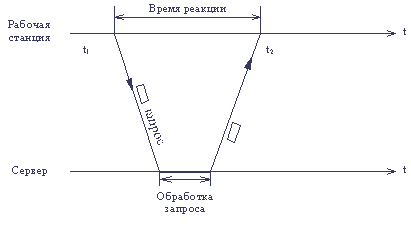 В общем случае, время реакции определяется как интервал времени между возникновением запроса пользователя к каму-либо сетевому сервису и получением ответа на этот запрос (рис. 1.1). Очевидно, что смысл и значение этого показателя зависят от типа сервиса, к которому обращается пользователь, от того, какой пользователь и к какому серверу обращается, а также от текущего состояния других элементов сети - загруженности сегментов, через которые проходит запрос, загруженности сервера и т.п.