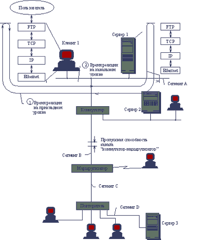 В примере 1 под временем реакции понимается время, которое проходит с момента обращения пользователя к сервису FTP для передачи файла с сервера 1 на клиентский компьютер 1 до момента завершения этой передачи. Очевидно, что это время имеет несколько составляющих. Наиболее существенный вклад вносят такие составляющие времени реакции как: время обработки запросов на передачу файла на сервере, время обработки получаемых в пакетах IP частей файла на клиентском компьютере, время передачи пакетов между сервером и клиентским компьютером по протоколу Ethernet в пределах одного коаксиального сегмента. Можно было бы выделить еще более мелкие этапы выполнения запроса, например, время обработки запроса каждым из протоколов стека TCP/IP на сервере и клиенте.