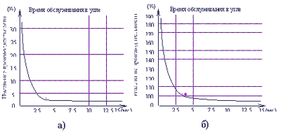 На рисунке 2.10б показана зависимость повышения производительности сети при переходе от пакетов 1024 байта протокола Ethernet к пакетам 4096 протокола TokenRing 16 Мб/с. Ясно, что при этом действует и фактор повышения пропускной способности, но как видно из рисунка 2.10а, этот фактор действует гораздо слабее. Действительно, при нулевом времени выполнения приложения общий выигрыш от действия этих двух факторов составляет 190%, в то время как при увеличении только пропускной способности производительность увеличилась всего на 30%.