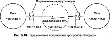 Уже сравнительно давно наблюдается дефицит IP-адресов. Очень трудно получить адрес класса В и практически невозможно стать обладателем адреса класса А. При этом надо отметить, что дефицит обусловлен не только ростом сетей, но и тем, что имеющееся множество IP-адресов используется нерационально. Очень часто владельцы сети класса С расходуют лишь небольшую часть из имеющихся у них 254 адресов. Рассмотрим пример, когда две сети необходимо соединить глобальной связью. В таких случаях в качестве канала связи используют два маршрутизатора, соединенных по схеме «точка-точка» (рис. 5.10). Для вырожденной сети, образованной каналом, связывающим порты двух смежных маршрутизаторов, приходится выделять отдельный номер сети, хотя в этой сети имеются всего 2 узла.