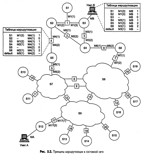 Рассмотрим принципы маршрутизации на примере составной сети, изображенной на рис. 5.2. В этой сети 20 маршрутизаторов объединяют 18 сетей в общую сеть; SI, S2,..., S20 — это номера сетей. Маршрутизаторы имеют по нескольку портов (по крайней мере, по два), к которым присоединяются сети. Каждый порт маршрутизатора можно рассматривать как отдельный узел сети: он имеет собственный сетевой адрес и собственный локальный адрес в той подсети, которая к нему подключена. Например, маршрутизатор под номером 1 имеет три порта, к которым подключены сети SI, S2, S3. На рисунке сетевые адреса этих портов обозначе-нь1 как М1(1), Ml (2) и М1(3). Порт М1(1) имеет локальный адрес в сети с номером S1, порт Ml (2) — в сети S2, а порт М 1(3) — в сети S3. Таким образом, маршрутизатор можно рассматривать как совокупность нескольких узлов, каждый из которых входит в свою сеть. Как единое устройство маршрутизатор не имеет ни отдельного сетевого адреса, ни какого-либо локального адреса.