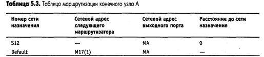 Ниже помещена таблица маршрутизации другого конечного узла составной сети — узла А (табл. 5.3). Компактный вид таблицы маршрутизации отражает тот факт, что все пакеты, направляемые из узла А, либо не выходят за пределы сети S12, либо непременно проходят через порт 1 маршрутизатора 17. Этот маршрутизатор и определен в таблице маршрутизации в качестве маршрутизатора по умолчанию.