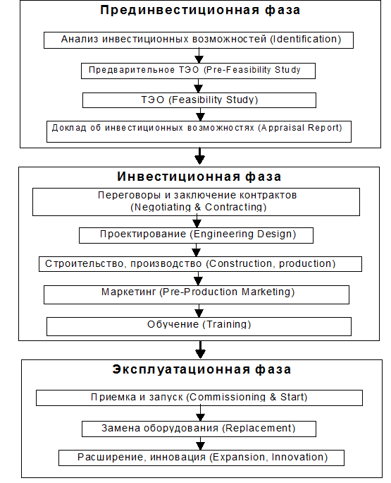 | 1. Изучение прогнозов и направлений развития страны (региона, города) 2. Формирование инвестиционного замысла 3. Подготовка ходатайства (Декларации) о намерениях 4. Предварительное согласование инвестиционного замысла 5. Составление и регистрация оферт 6. Разработка обоснования инвестиций, оценка жизнеспособности проекта 7. Выбор и предварительное согласование места размещения объекта 8. Экологическое обоснование 9. Экспертиза 10. Предварительное инвестиционное решение 11. Разработка предварительного плана проекта | 1. Разработка плана проектно-изыскательских работ 2. Задание на разработку ТЭО (проекта) строительства и его разработка 3. Согласование, экспертиза и утверждение ТЭО (проекта) строительства 4. Выдача задания на проектирование 5. Разработка, согласование и утверждение рабочей документации 6. Принятие окончательного решения об инвестировании 7. Отвод земли под строительство 8. Разрешение на строительство 9. Задание на разработку проекта производства работ 10. Разработка плана проекта | 1. Тендеры на проектно-изыскательские работы и заключение контрактов 2. Тендеры на поставку оборудования и заключение контрактов 3. Тендеры на подрядные работы и заключение контрактов 4. Тендеры на услуги консультантов и заключение контрактов 5. Разработка планов (графиков) поставки ресурсов 6. Подготовительные работы к строительству | 1. Разработка оперативного плана строительства 2. Разработка графиков работы машин 3. Выполнение строительно-монтажных работ 4. Мониторинг и контроль 5. Корректировка плана проекта и оперативного плана строительства (управление изменениями) 6. Оплата выполненных работ и поставок | 1. Пусконаладочные работы 2. Сдача-приемка объекта 3. Закрытие контракта 4. Демобилизация ресурсов 5. Анализ результатов | 1. Эксплуатация 2. Ремонт 3. Развитие производства 4. Закрытие проекта: § вывод из эксплуатации § демонтаж оборудования § модернизация (начало нового проекта) |