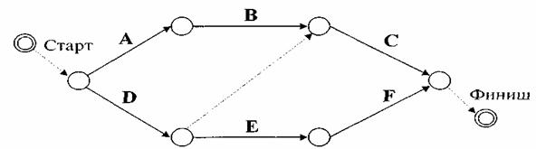 · Метод построения стрелочных диаграмм (ADM – Arrow Diagramming Method). Это метод построения сетевых диаграмм (графиков) проекта с использованием стрелок для изображения работ, а соединение стрелок в узлах показывает зависимости. На рис. 3.4. показана простая сетевая диаграмма, созданная с помощью ADM. Метод также носит название «Работа по стрелке» (АОА – activity - on - arrow) и, хотя не так широко распространен, как PDM, но еще используется в некоторых прикладных сферах.