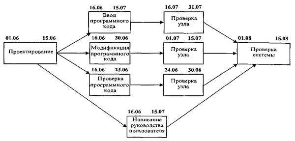 • Сетевые диаграммы (графики) проекта с добавленной информацией о датах (рис. 3.6.). Эти графики обычно показывают логику проекта и работы критического пути проекта.