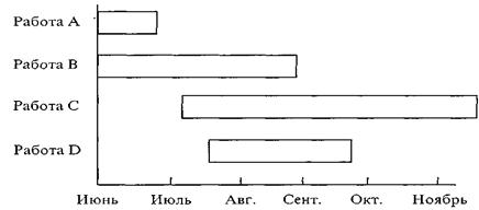 • Линейные графики, также называемые графиками Ганта (рис. 3.7.), показывают даты начала и окончания работ, а также их ожидаемые продолжительности, но обычно не показывают зависимости. Их достаточно легко читать и их часто используют для представления при управлении.