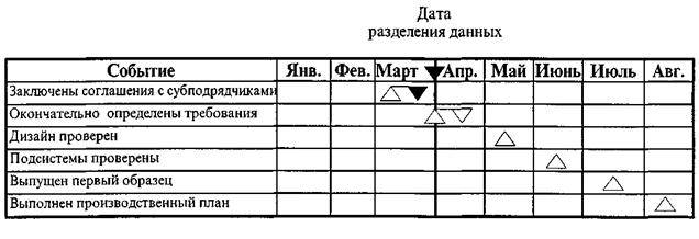 • Поэтапные календарные планы (рис. 3.8.) родственны линейным графикам, но определяют запланированные даты начала или завершения основных этапов проекта и основных внешних взаимодействий.