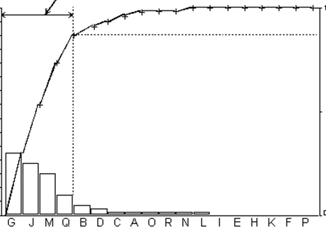 Анализ Парето, как правило, иллюстрируется диаграммой Парето (рис. 5.7.), на которой по оси абсцисс отложены причины возникновения проблем качества в порядке убывания вызванных ими проблем, а по оси ординат — в количественном выражении сами проблемы, причем как в численном, так и в накопленном (кумулятивном) процентном выражении.