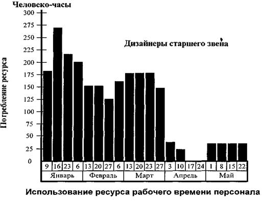 ·План управления кадрами. План управления кадрами описывает какие человеческие ресурсы необходимы проекту, когда и как они будут вовлечены или отстранены из команды проекта. План управления кадрами может быть как формальным, так и неформальным, очень подробным или ограниченным в зависимости от нужд проекта. Это вспомогательный элемент всеобщего плана проекта. План управления кадрами часто включает ресурсные гистограммы, как показано на рис. 6.2. Особое внимание следует обратить на то, каким образом члены команды (индивидуальные лица или группы) проекта будут отпускаться, когда в них больше не будет нужды в проекте.