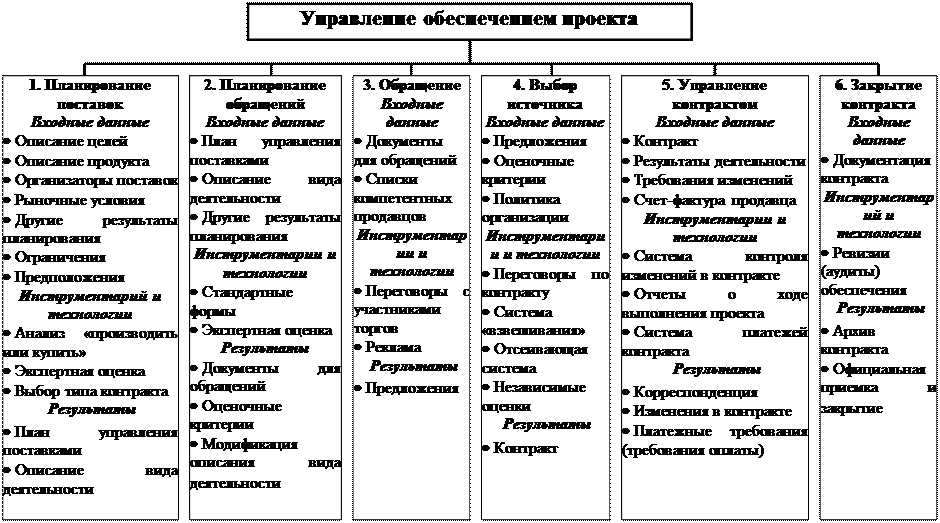 Управление обеспечением проекта включает процессы, необходимые для приобретения товаров и услуг за пределами исполняющей организации. Для простоты товары и услуги независимо от их количества будем называть «продуктами». Рис. 9.1 дает обзор следующих главных процессов: