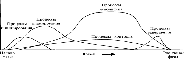 В дополнение, группы процессов управления проектами не являются дискретными одноразовыми событиями - это пересекающиеся работы, проявляющиеся с разными уровнями интенсивности внутри каждой фазы проекта. Рис. 11.2. иллюстрирует, как группы процессов пересекаются и видоизменяются внутри фазы.
