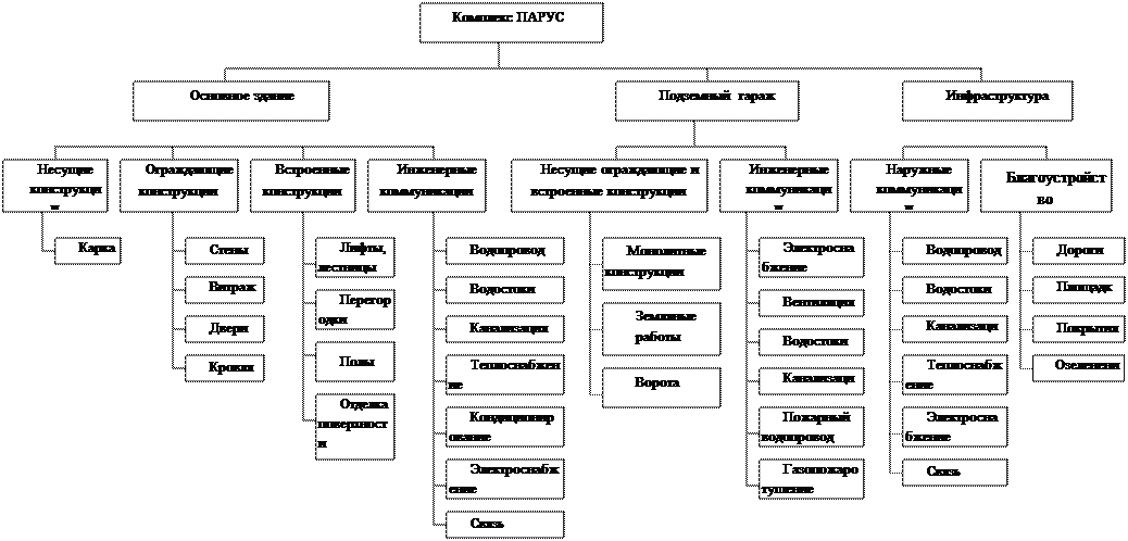 Структуризация продукта проекта производится для последующего формирования комплекса работ. На рис.2. представлена структура продукта проекта «Создание делового центра «Парус». В качестве основания для структуризации на первом уровне приняты части комплекса (основное здание, подземный гараж, инфраструктура). Для двух первых частей дальнейшая структуризация проводилась по назначению строительных конструкций (несущие, ограждающие, встроенные) с выделением инженерных коммуникаций. Для третьей части комплекса – инфраструктуры – структуризация проведена по виду работ (коммуникации и благоустройство).
