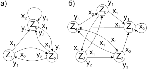 Рис. 1. Графы автоматов Мили (а) и Мура (б).