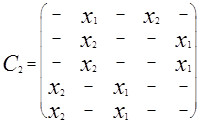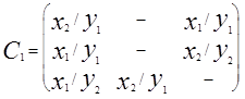 При решении задач моделирования часто более удобной формой является матричное задание конечного автомата. При этом матрица соединений автомата есть квадратная матрица С=|| cij ||, строки которой соответствуют исходным состояниям, а столбцы - состояниям перехода. Элемент cij=xk/yS в случае автомата Мили соответствует входному сигналу xk, вызывающему переход из состояния zi в состояние zj и выходному сигналу yS, выдаваемому при этом переходе. Для автомата Мили F1, рассмотренного выше, матрица соединений имеет вид: