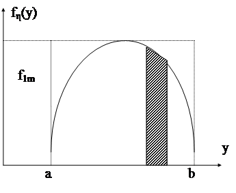 где f1h(y)=max| fh(y)|. При этом y1m и z1m+1 - значения случайных величин, равномерно распределенных на интервале (a,b) и (0,f1m). Эти значения можно рассматривать как абсциссы и ординаты случайных точек, равномерно распределяющихся внутри прямоугольника со сторонами b-a и f1m, охватывающего кривую распределения fh(y) (см. рисунок 7.2.).