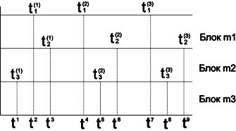 Рассмотрим машинную модель Mm, системы S как совокупность блоков {mi}, i=1,2…n. Каждый блок модели можно охарактеризовать конечным набором возможных состояний {Z0}, в которых он может находиться. Пусть в течение рассматриваемого интервала времени (0,Т) блок i изменяет состояние в моменты времени tij£Т, где j - номер момента времени. Момент времени можно разделить на три группы: