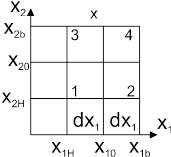 Каждому фиксированному набору уровню факторов соответствует определённая точка в многомерном пространстве, называемая факторным пространством. Эксперименты не могут быть реализованы во всех точках факторного пространства, а лишь в принадлежащих допустимой области, как это например оказано для случая двух факторов Х1 и Х2 на рисунке (см. ниже рис. 11.1.).