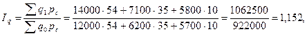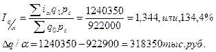 Физический объем продукции в отчетном периоде по сравнению с базисным увеличился на 15,2%, что в абсолютном выражении даёт изменение стоимости продукции: