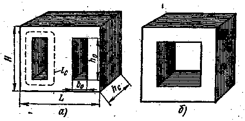 Сердечники трансформаторов: а — броневой, б — стержневой