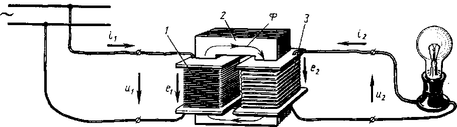При подключении трансформатора к источнику переменного тока (электрической сети) в витках его первичной обмотки протекает переменный ток i1, образуя переменный магнитный поток Ф. Этот поток проходит по магнитопроводу трансформатора и, пронизывая витки первичной и вторичной обмоток, индуцирует в них переменные э. д. с. е1 и е2. Если к вторичной обмотке присоединен какой-либо приемник, то под действием э. д. с. е2 по ее цепи проходит ток i2.