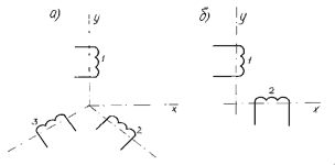 называют условиями кругового поля в m - фазной машине. В электрических машинах переменного тока для создания вращающегося поля используются в основном трехфазные (рис. 2.1.,а) и двухфазные (рис.2.1.,б) обмотки.