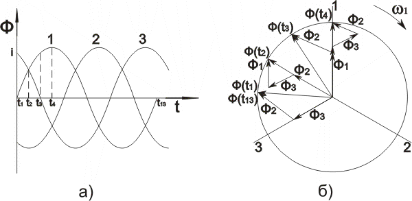 Обмотка, создающая вращающееся поле, представляет собой m-фазную систему, т.е. состоит из m обмоток, которые сдвинуты друг относительно друга в пространстве и по которым протекают токи, сдвинутые во времени. Каждая из обмоток фаз создает пульсирующий поток (неподвижный в пространстве и изменяющийся во времени), сдвинутый относительно других в пространстве и во времени. Если все обмотки фаз имеют одинаковое число витков и сдвинуты в пространстве на электрический угол γ2 = 2π /m (электрический угол – это пространственный угол, умноженный на число пар полюсов рм), токи имеют одинаковую амплитуду Im и частоту f и сдвинуты во времени на угол β= 2π /m, то результирующее магнитное поле будет круговым. Это означает, что поток представляет собой вектор постоянной длины, вращающийся в пространстве с постоянной угловой скоростью. Конец этого вектора описывает окружность, его значение Ф= (m /2)Фм, где Фм - амплитудное значение потока обмотки фазы. Условия