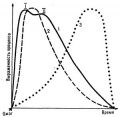 Рис. 3. Схема соотношения основных процессов острого (ожогового) воспаления: 1 — альтерация первичная (I) и вторичная (II); 2 — экссудация; 3 — пролиферация