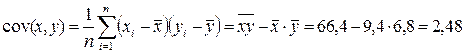 5. Выборочная ковариация (выборочный корреляционный момент) cov (x, y) находится по формуле (1.8). Среднее произведений вычисляется в 8 столбце таблицы, из него вычитается произведение средних.