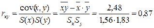 6. Вычислим выборочный коэффициент корреляции rxy по формуле (1.7):