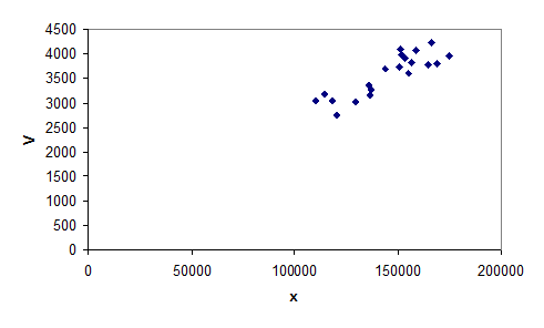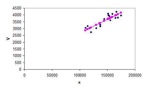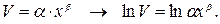 По форме облака рассеяния видно, что наше предположение о степенной модели наблюдений (см. рис. 3.1) подтверждается. При оценивании коэффициентов такой модели метод наименьших квадратов применяют к логарифмам уровней. Степенная модель линеаризуется путем логарифмирования: